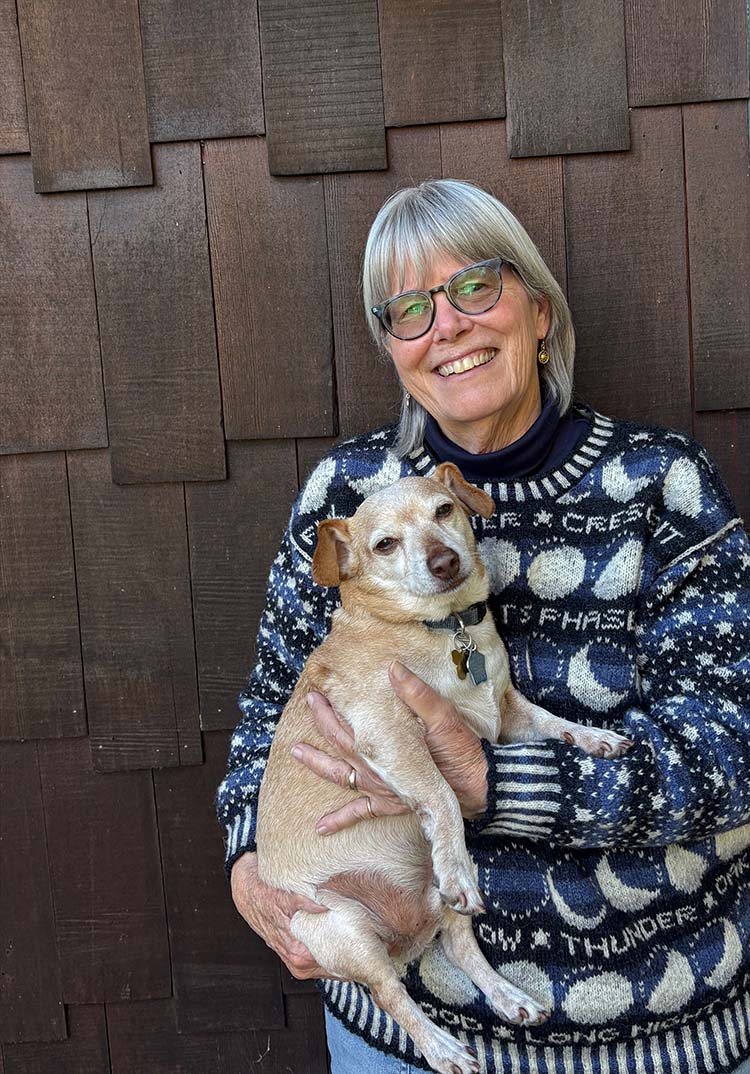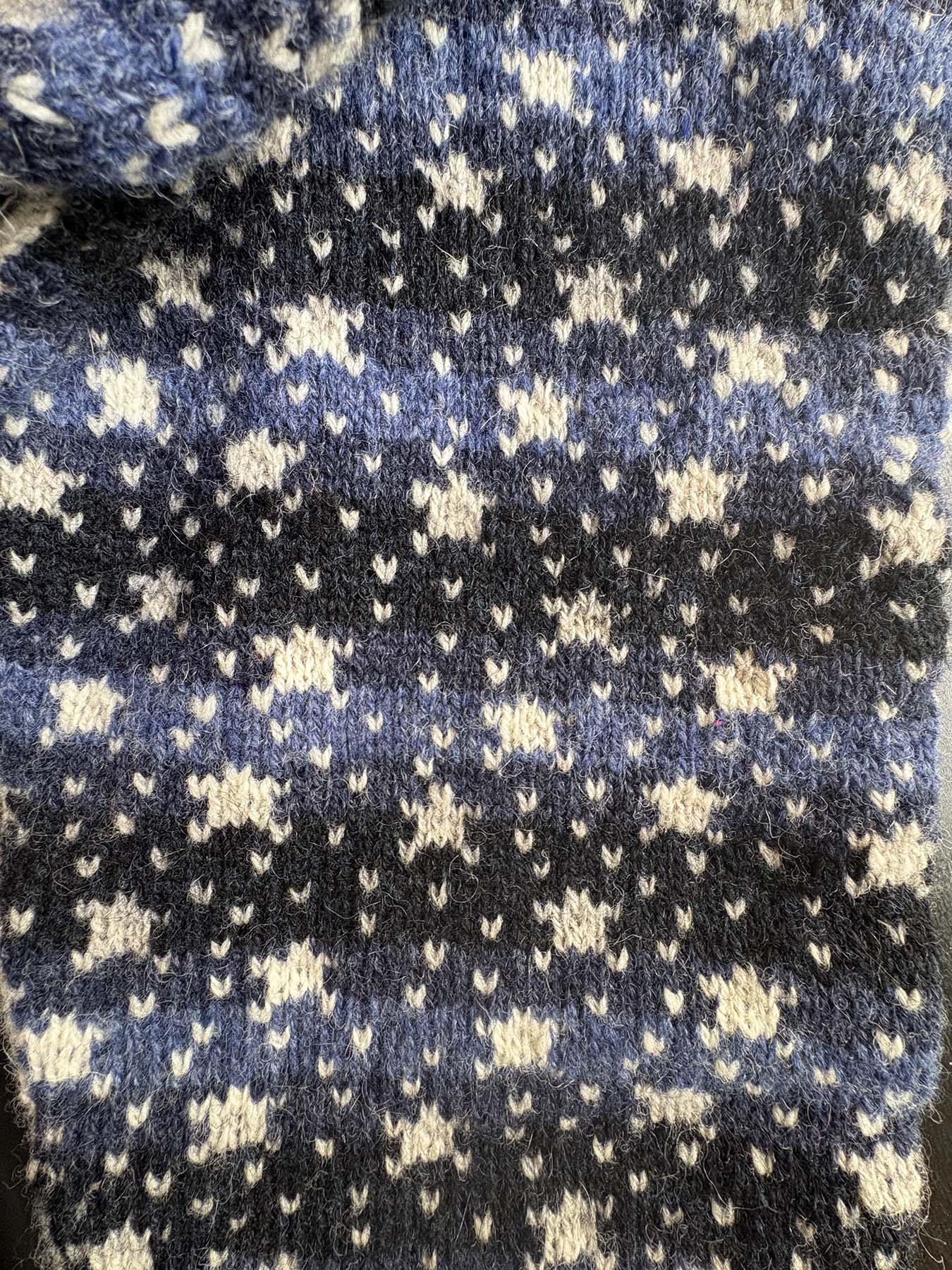 The Luna Sweater is knit in the round using 6 shades of Jamieson’s Shetland Spindrift fingering-weight yarn; only two colors are used each round. The moon’s phases—new, crescent, quarter, gibbous, and full—march across the sweater on a ground of deepest blues. Frequent trapping in the moon rows creates texture.